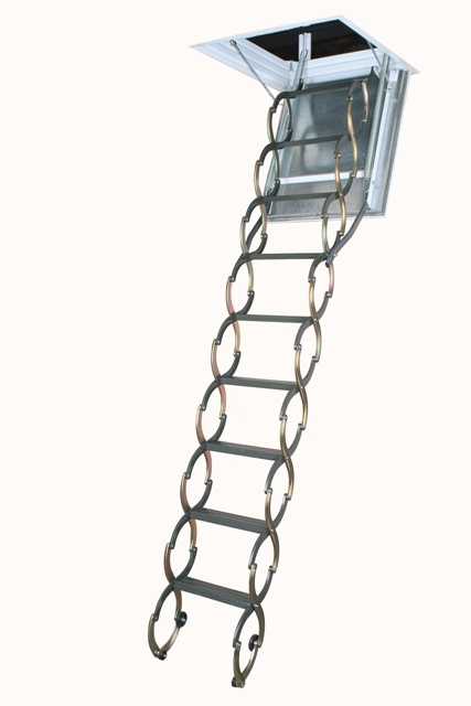 В ассортименте FAKRO есть также и складные чердачные лестницы «ножничного» типа. Такие модели выполнены из металла, защищенного от коррозии. Поставляются совместно с потолочным коробом, позволяющим хранить сложенную чердачную лестницу «в потолке».